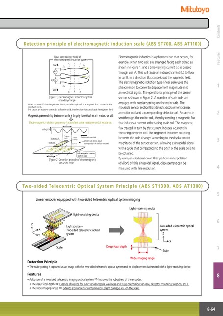 Detectionprincipleofelectromagneticinductionscale(ABSST700,ABSAT1100)BasicoperationprincipleofelectromagneticinductionsystemL1CoilA〜V2VI1I2L2CoilB[Figure1]ElectromagneticinductionsystemencoderprincipleWhenacurrent(I1)thatchangesovertimeispassedthroughcoilA,amagneticfluxiscreatedinthevicinityofcoilA.Thiscausesaninductivecurrent(I2)toflowincoilB,inadirectionthatcancelsoutthemagneticfield.Magneticpermeabilitybetweencoilsislargelyidenticalinair,water,oroil.Electromagneticinductiontypesensorhasexcellentwaterresistanceandoilresistance.PVoltage(V)DetectingcoilDisplce-mentExcitercoiPSensorsectionScalcoilDisplcementmagnitudeMulti-trackdesignallowsconfigurationofabsoluteencoderCoilsarrangedatconstantpitchonscale[Figure2]DetectionprincipleofelectromagneticinductionscaleElectromagneticinductionisaphenomenonthatoccurs,forexample,whentwocoilsarearrangedfacingeachother,asshowninFigure1,andatime-varyingcurrent(I1)ispassedthroughcoilA.Thiswillcauseaninducedcurrent(I2)toflowincoilB,inadirectionthatcancelsoutthemagneticfield.Theelectromagneticinductiontypelinearscaleusesthisphenomenontoconvertadisplacementmagnitudeintoanelectricalsignal.TheoperationalprincipleofthesensorsectionisshowninFigure2.Anumberofscalecoilsarearrangedwithprecisespacingonthemainscale.Themoveablesensorsectionthatdetectsdisplacementcarriesanexcitercoilandacorrespondingdetectorcoil.Acurrentissentthroughtheexcitercoil,therebycreatingamagneticfluxthatinducesacurrentinthefacingscalecoil.Themagneticfluxcreatedinturnbythatcurrentinducesacurrentinthefacingdetectorcoil.Thedegreeofinductivecouplingbetweenthecoilschangesaccordingtothedisplacementmagnitudeofthesensorsection,allowingasinusoidalsignalwithacyclethatcorrespondstothepitchofthescalecoilstobeobtained.Byusinganelectricalcircuitthatperformsinterpolation(division)ofthissinusoidalsignal,displacementcanbemeasuredwithfineresolution.Two-sidedTelecentricOpticalSystemPrinciple(ABSST1300,ABSAT1300)Linearencoderequippedwithtwo-sidedtelecentricopticalsystemimagingLight-receivingdeviceZXYLight-receivingdeviceLightsource+Two-sidedtelecentricopticalsystemScaleDeepfocaldepthTwo-sidedtelecentricopticalsystemZXScaleDetectionPrinciple•Thescalegratingiscapturedasanimagewiththetwo-sidedtelecentricopticalsystemanditsdisplacementisdetectedwithalight-receivingdevice.WideimagingrangeFeatures•Adoptionofatwo-sidedtelecentricimagingopticalsystem⇒Improvestherobustnessoftheencoder.•Thedeepfocaldepth⇒ExtendsallowanceforGAPvariation(scalewavinessandstageorientationvariation,detectormountingvariation,etc.).•Thewideimagingrange⇒Extendsallowanceforcontamination,slightdamage,etc.onthescale.8-64